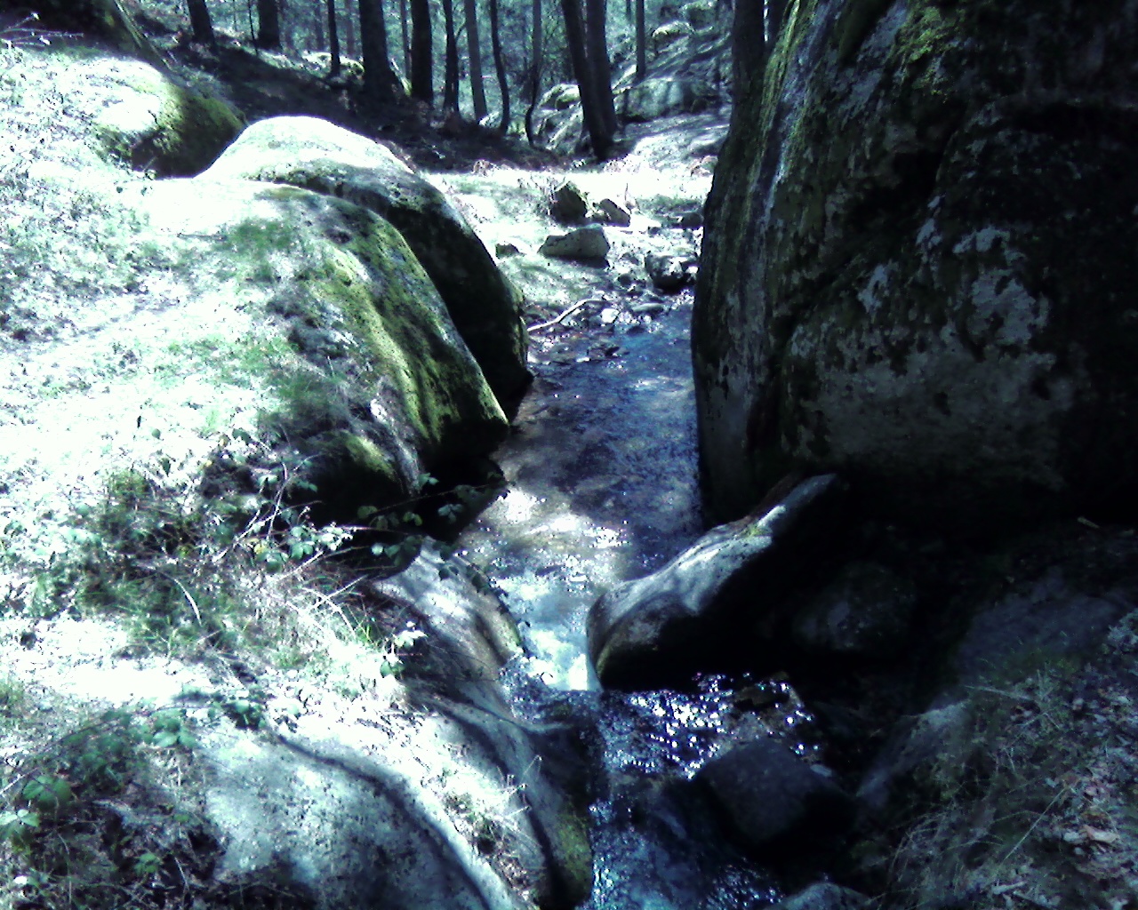 Jack se descojona ya que me estaba avisando que veía la cámara en agua. Yo me descalzo y me meto en el arroyo, buscando la cámara por el salto de agua, pero es inútil, demasiado caudal para ver algo y la temperatura, el agua esta helada.