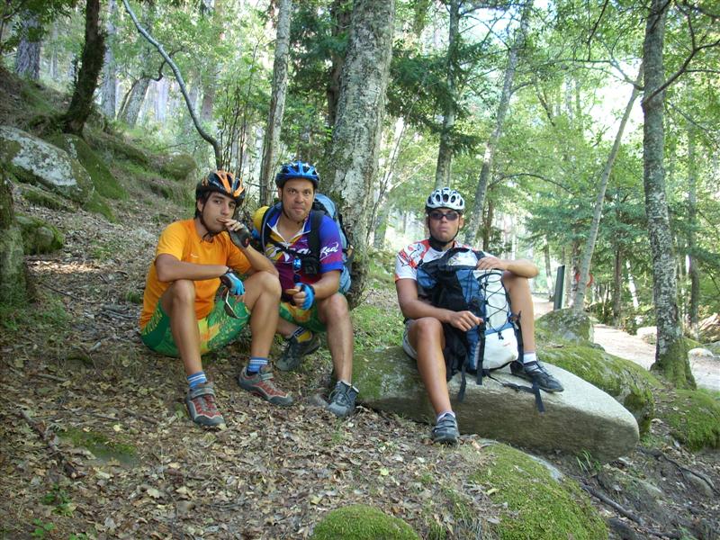Tras el collado de la mina ya solo nos queda bajar hacia el puerto de los Leones en el cual nos tomamos un café y un pincho de tortilla. Una vez repuestas las fuerzas bajamos un par de kilómetros por carretera y tomamos el desvío que nos adentra en la pista del río moros, las cual la recorreremos por su parte superior hasta el desvío del collado marichivas, el cual yo me lo pateo entero y mis compis se lo suben montado. En el collado nos encontramos a nuestros amigos picapedreros a los que saludamos, nos hacemos una risas y continuamos hasta el puerto de la fuenfría, ni paramos directamente todo para abajo hacia la fuente de la reina en donde reponemos agua y perdemos un cachito de corazón al enamorarnos de una amazona, simplemente preciosa, y cuando se nos pone con el culo en pompa para beber agua, casi nos da algo.