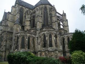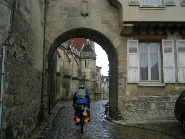 Por carreteras locales llegamos a noyon y la lluvia deja por un instante de caer mostrándonos un trocito de cielo, pero eran falsas esperanzas y tenemos que refugiarnos en el soportal de la catedral para secarnos un poco. Disfrutamos de la catedral y continuamos entre más lluvia.