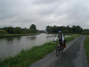 A las 9:00 de la mañana comenzamos a rodar por las calles de San Quintín, vemos el monumento a los caídos, la catedral y la plaza del ayuntamiento, la cual es una playa artificial. Salimos de San Quintín por el carril bici junto al canal y empieza a llover. Nos ponemos los chubasqueros, nuestra mejor sonrisa y a continuar rodando por pequeños pueblos que se suceden sin apenas haber distancia entre uno y otro.