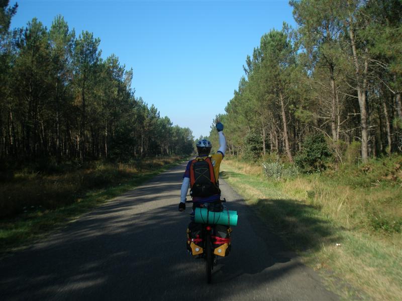 Esta gran llanura de las landas la rodamos sin mucho esfuerzo manteniendo una velocidad constante entre 23 y 27 km/h, Nuestros casi únicos compañeros en la carretera son enormes camiones cargados con troncos procedentes de las talas, resulta impresionante ver como una maquina arranca los pinos y a su vez doloroso, al contemplar los claros que las maquinas van dejando tras de si.