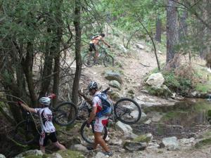 Tras la vereda alta alcanzamos la pista de la fuenfría y decidimos seguir por ella hasta el puerto de la fuenfría y alcanzar maravichívas. Una vez en la puerta, Mass nos mete por un sedendero maravillosos que nos abrira las puertas en un futuro a grandes rutas y que disfrutamos a tope en los dos sentidos ya que recorremos solo la mitad, no nos da tiempo recorrerlo entero, por eso lo he quitado del track para no confundir. A la vuelta de la mitad del sendero un peazo de abrojo pincha mi rueda trasera y ya van dos pinchazos en el fin de semana, reparamos y volvemos otra vez a marichivas en donde Mass nos baja por un sendero para senderistas, que es inciclable en su mayoria y lo que hacemos es eso portar la bici y andar, pero con buen humor siempre. Una vez que alcanzamos el camino viejo, la cosa cambia y disfrutamos de una de las mejores bajadas que hay en cercedilla hasta las dehesas..