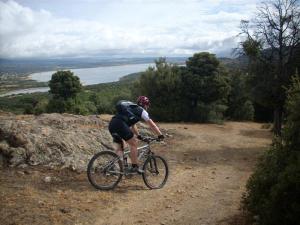 Nos cruzamos con un padre que esta montando con su hijo, le esta enseñando a bajar, a tener confianza sobre su bici, me gusto ese “…. Suelta frenos y culo atrás”, sin lugar a dudas una frase que encierra uno de los pilares del MTB. Por desgracia para nosotros es sube piñones y dale al pedal ya que es cuesta arriba, pero disfrutamos por esta subida trialera, Nos cruzamos con una pareja, ella marca el camino, la pregunto por donde se va a tirar, y me marca la bajada más chunga, no se lo piensa y se tira, veo a su acompañante que pone píe a tierra al ver el pequeño escalón que tiene que superar para iniciar la bajada, como me gustan la mujeres con decisión. Ya estamos casi dentro del cinturón de la Hoya, y las rampas de inicio aunque suaves comienzan a pesar en las piernas de Mon que se las toma con filosofía, es lo mejor, a el como a mi lo que nos gusta es disfrutar de lo que nos rodea, la bici es el mejor medio para acércanos a la