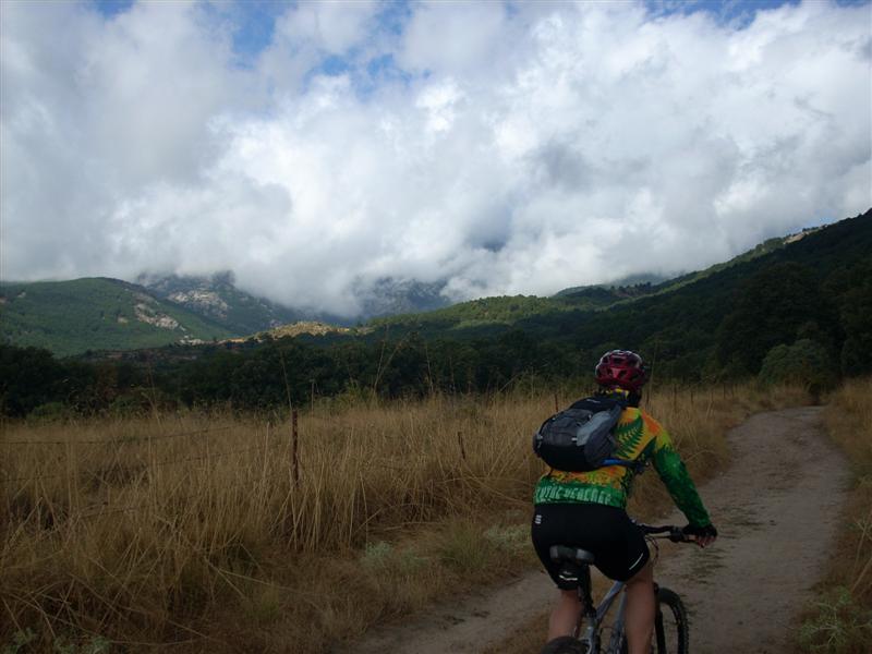 El día se ha levantado cubierto, el suelo esta mojado tras el paso de unos grandes nubarrones que se van alejando de la sierra, la temperatura es buena pero se agradece la manga la larga. Salimos a las 9:30 rumbo a moralzarzal, disfrutamos de unos pequeños senderos para no bajar por pista y enlazar con los buenos senderos que nos conducen de Moralzarzal hasta la cañada real y de hay al gran sendero que baja hasta Manzanares. Mon rueda a baja revoluciones ya que esta de vuelta de sus vacaciones, el no conoce esta zona de senderos y los disfruta con su bici rígida.