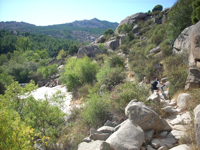 naturaleza y vivirla con intensidad. El azul se ha apoderado del cielo exhibiendo cuatro nueves como trofeo de guerra, llegamos a una especie área de recreo un tanto chapucera en la que parte un track que nos conduciría a la zona de Hoyo cerrado, no veo nada clara, ni la entrada ni la continuidad del track, así como el sendero que se le ve difuso y algo sucio. Decidimos hacer solo la Hoya y vemos que las reservas de agua están al limite, se que hay una fuente unos kilómetros mas adelante, pero como me podía imaginar por el cauce de los ríos que habíamos cruzado esta seca. Optamos por completar la bajada y comer en Manzanares el Real con agua o un refresco, así que Mon termina de sufrir las últimas rampas con sus descansos reparadores y disfrutamos de una bajada maravillosa con miles de curvas que te obligan a exprimirte al máximo en cada paso. Mi nueva burrilla y yo nos estamos acoplando y decido darla un poco de cancha en algunos pasos y dejar otros para más adelante que aún nos estamos conociendo.
