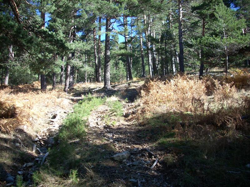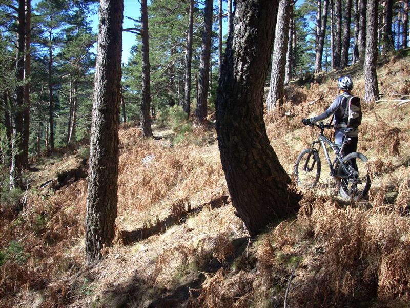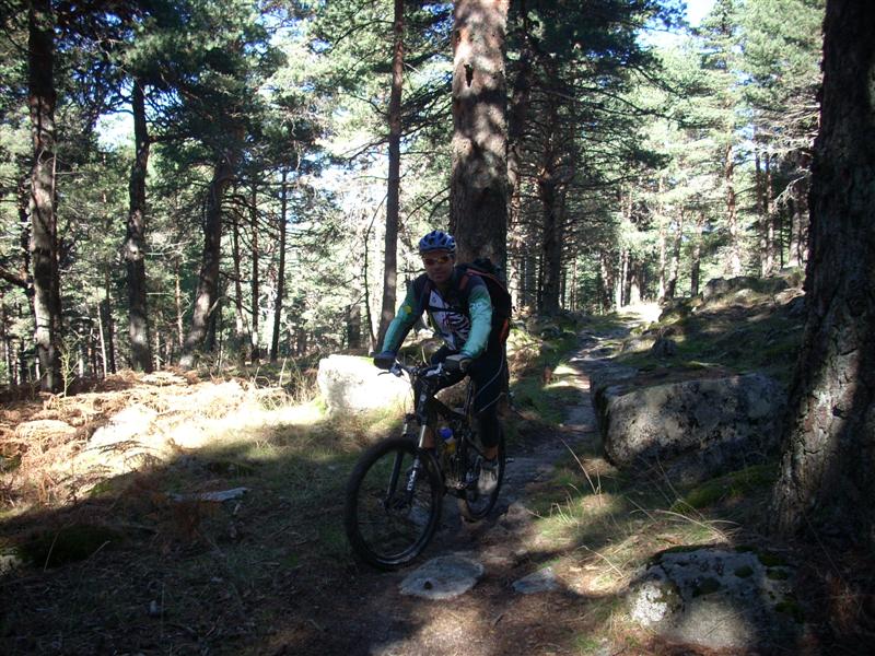 Subimos la pestosa carretera de la república, pasamos el mirador y coronamos la fuenfría pasando a gran cantidad de bikers. En la fuenfría estoy muerto de hambre y tomamos una barrita. Continuamos ruta hasta el collado marichivas y nos tiramos por el sendero paralelo al pedregal, toda una delicia que disfruto hasta el final montado pero con mucho miedo ya que se me olvido bajar el sillín y la pendiente era de las buenas. JJ se baja algo más de la mitad, la bici doble le da confianza y se anima con tramos que ni soñaba en intentar bajar. Recorremos la pista del río moros a gran velocidad hasta enlazar con la senda del arcipreste, toda una delicia para recorrela en calma y buscar el paso entre las rocas disfrutando, sufriendo ya que es en subida pero apasionante.