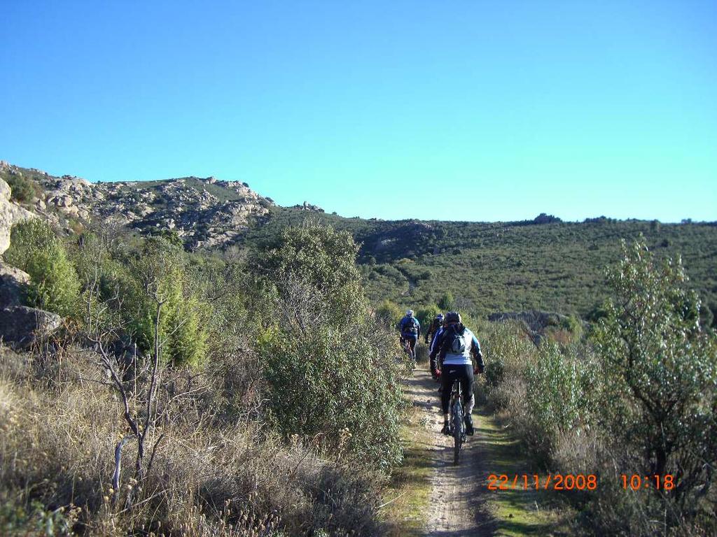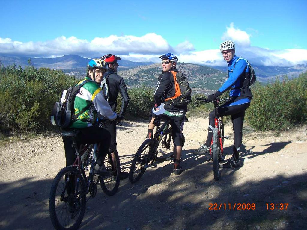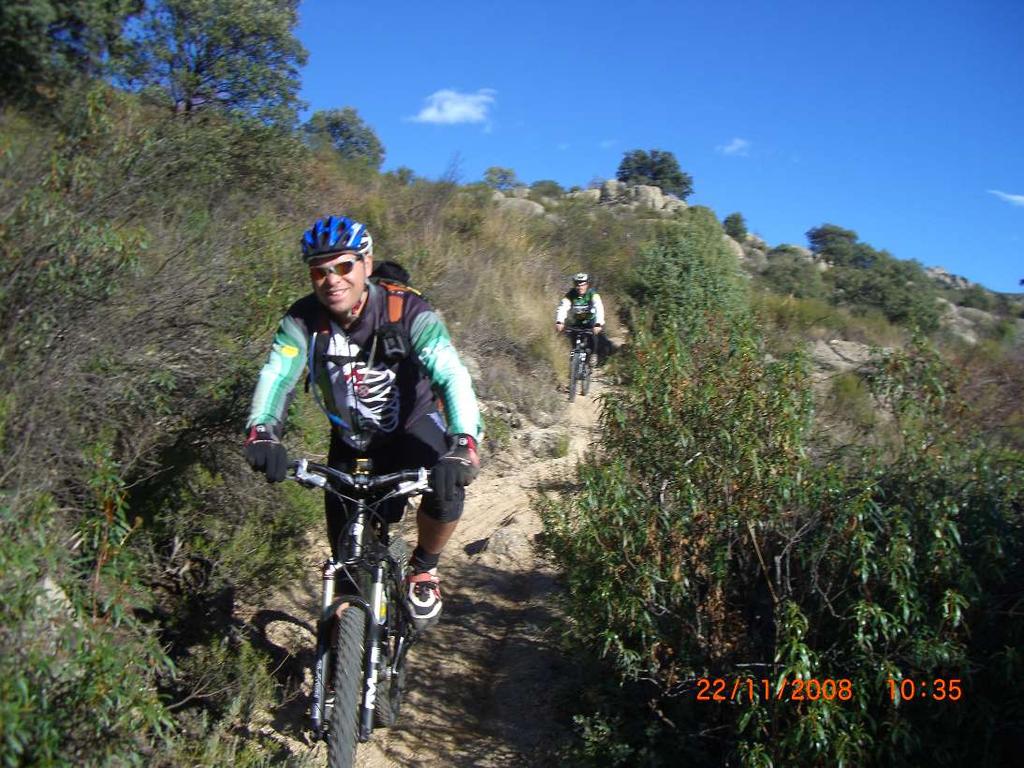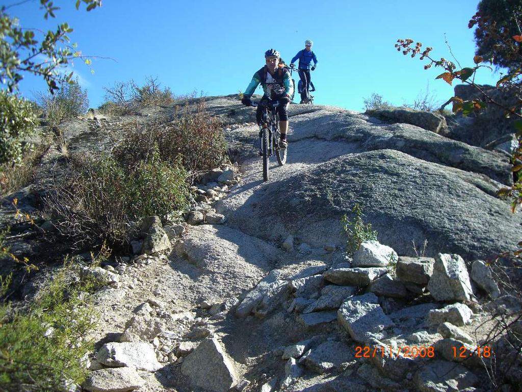 Llego pronto, me da tiempo a prepararme tranquilamente y jugar un rato con mi bici, poco a poco van apareciendo foreros hasta formar el grupo de 10 que partimos rumbo hacia la sierra de hoyo. Salimos de Villalba subiendo por cuestas “tranquilas” el cielo es de un azul intenso y el viento sopla a ratos, con las primeras mfoto-010ini rampas nos damos cuenta que vamos muy abrigados. Salimos hacia las pistas que nos suben a la sierra por un sendero divertido, con las primeras rampas más duras decidimos a la altura de las gallinas gigantes “avestruces” quitarnos ropa. Como ya estamos casi arriba nos toca un breve descenso muy divertido pero muy corto, Vato me enseña una variante para ir hacia la losa con un poco de pateo pero con una trialera intensa en su descenso hacia la losa, y vamos si era intenso que se me fue la rueda delantera y bese el suelo sin consecuencias, bueno si una vez que me caigo en una ruta ya no bajo igual y disfruto menos, esta nueva bici no termino de cogerle el punto a las bajadas y me veo muy inseguro, eso o me hago mayor y ya me cuesta dejar las pistas, rodar y rodar. Pero esta vez me repongo y bajo la losa sin dudar, tras esta bajada nos metemos por la tubería y aquí nos tocara patear un poco, hasta coronamos el mini montículo y disfrutamos de otro sendero intenso con un cortado al lado derecho que da miedo, si bajáis recordar por el izquierdo. Llegamos a la carretera y tras una pequeña subida llegamos al mirador y a la bajada de los bomberos, divertida pero algo corta. Tras la bajada de los bomberos disfrutamos de unos senderitos y una bajada divertida hasta llegar a Hoyo de manzanares, lo sorteamos por las primeras callescimg6825 del pueblo y subimos una gran cuesta hasta adentrarnos de nuevo en las pistas y senderos que nos dejarán de nuevo en la tubería, esta vez si en su sentido bueno y disfrutamos la bajada de la gran roca con un poco de acojone, jejeje.