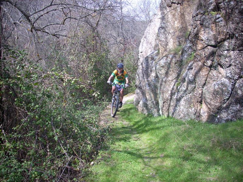Pasamos la ermita del cerrillo y disfrutamos de un sendero fantástico entre pinos que nos dejara en el comienzo de una trialera muy rápida y divertida que desemboca a orilla del embalse de Valmayor. Tras la trialera los senderos estrechos y revirados del embalse, que siempre me dejan las pulsaciones al límite pero es que hay que disfrutarlos a tope para sacarles todo el gustillo y es mucho lo que tienen. Una pausa en el dique del club náutico en el que Toni nos demuestra que ni tiene vértigo, poniéndose de pie el muro de la presa con una caída espectacular a su lado. La segunda tanda de senderitos también muy divertidos nos dejan en los prados de la Laguna, o ya orientados en lo que todo el mundo conoce como «el camino de la puertas» por la cantidad de ellas que hay que abrir y cerrar tras su paso. Raquel en tono jocoso me dice que vamos los primeros toda la ruta guiando y marcando el ritmo, yo la recuerdo que la primera mitad es todo bajada y luego queda subir lo que ahora estamos disfrutando con cierta alegría en el pedaleo.