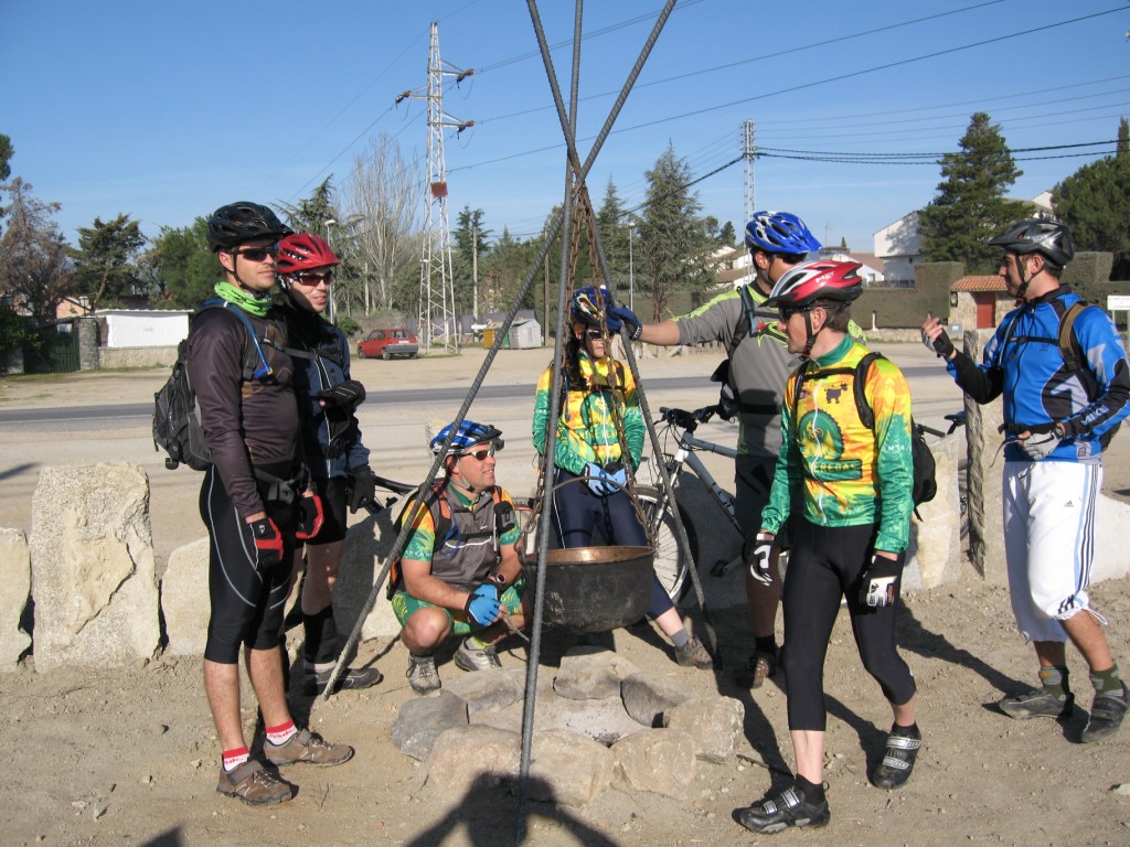 Hemos quedado a las 8:30 de la mañana en la estación de tren de collado mediano y con puntualidad británica nos juntamos Raquel, Toni, Popuser con un amigo, El Chaval, Obre y Only. Comenzamos la ruta disfrutando de un pequeño sendero que nos dejara en el paso a nivel de la vía para tras una breve subida poder disfrutar de la primera trialera del día sin apenas casi haber entrado en calor. La bajada de Collado a Alpedrete es muy divertida con pasos en escalones muy sencillos que te dejan un buen sabor de boca al entrar en Alpedrete, en este punto nos encontramos con Garbu que nos espera y completamos el grupo poniendo rumbo hacia Villalba. Esta vez he decidido no cruzar el pueblo por la estación y subir por la vía pecuaria, hace unas semanas puede ver con JJ como la habían arreglado, la han dejado muy chula, recreando incluso una especie de ruina de chozo de pastores en donde nos hacemos una foto curiosa de grupo frente a una olla que han colgado de tres hierros anclados en el suelo.