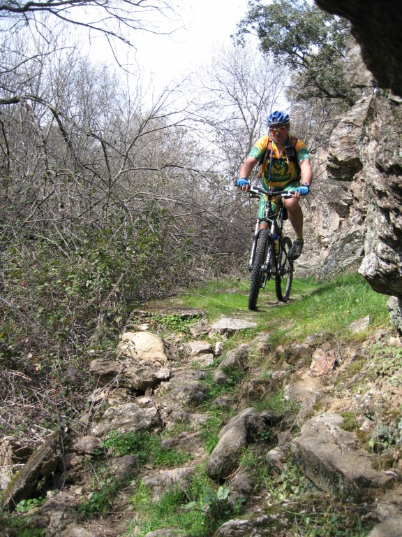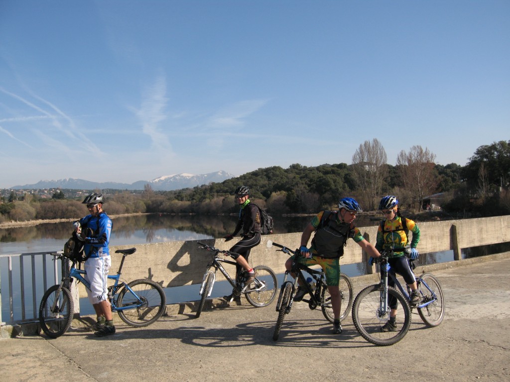 marcha y la pido permiso para meterla mano, ella accede pero el terreno no nos permite estar con el dedito por lo que lo dejamos hasta la próxima parada. En una pequeña parada para tomar una barrita, se propone cambiar la ruta hacia la montaña y disfrutar de unas bajadas divertidas, a mi no me gustan este tipo de propuestas en mitad de una ruta, pero bueno me gusta que la gente opine y decida, yo lo tenia claro, continuaría con mi ruta. Al final continuamos todos y en el Escorial me doy cuenta que el tramo que dibuje desde ese punto hasta el aulencia esta desplazado por lo que me cuesta mucho guiar y me pierdo al fiarme del track y no de mi instinto o de Only que si recordaba como yo que nos tocaba salir por la rotonda de la pradera de la virgen y subir un trozo pequeño del puerto. Pero el sufrimiento de rodar por carretera lo compensa con creces el sendero de Peralejo, toda una maravilla en la que me vuelvo a hacer Kakita en el paso de siempre, no tengo remedio. De peralejo a Valdemorillo vamos alternando pista con bajadas rápidas y pequeños repechos que nos sacan los colores. En Valdemorillo reponemos agua y afrontamos las duras subidas del camping , en la urbanización contigua tenemos un pequeño despiste pero una vez reagrupados todos de nuevo nos lanzamos hacia la presa del aulencia, al llegar al dique vemos como dos operarios están limpiando el fondo, no han dejado nada de sitio en el pasarela para poder pasar con las bicis y tenemos que hacer malabarismos para sortear los dos pequeños montones de porquería, los operario no son muy listos ya que han dejado la carretilla entre los dos montones por lo que no podrán sacarla ni hacia un lado ni hacia otro, en fin mejor no comentar.