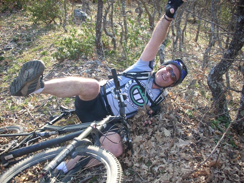 manto de hojas secas y lo mullida de la hierba hacen que junto a una considerable inclinación sea casi inciclable. En uno de estos pasos a JJ no le sale un pie del pedal, la rueda delantera se le bloquea y se va al suelo casi parado, me pide ayuda para quitarse la bici de encima, cuando tiro de la bici esta como enganchada, miro y no veo nada, pero cuando miro el sillín veo que esta enganchado el culote de JJ a la altura de su culo, mira el golosón como no se quejaba cuando tiraba de el jejejeje.
