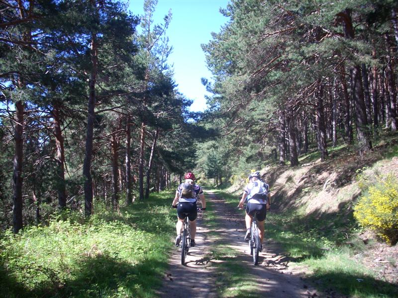 Volvemos al duro trabajo de dar pedales y al llegar al último giro antes de la bajada lío a mis compañeros para subir por una senda de exploración, la senda es pendiente, pero se puede subir montado, la verdad es que es muy disfrutona, unos hitos nos guían hacia una zona de pinos que en su centro tiene una explanada de césped preciosa, Pantani dice que parece una pista de aterrizaje de extraterrestres y yo veo más un lugar idóneo para aquelarres y locas fiestas nocturnas al estilo medieval, tipo Asterix y Obelix. En esta zona no encontramos salida pero si una senda que se pone muy malita en subida. Mon nos propone venir otro día con bocata en plan “caza senderos” y lo apuntamos. Al bajar nos encontramos con dos bikers que andan como nosotros buscando variantes.