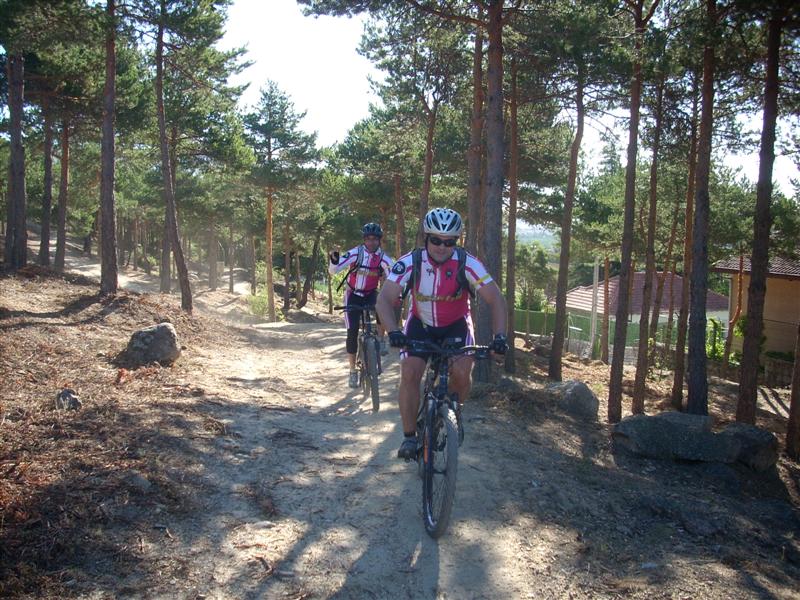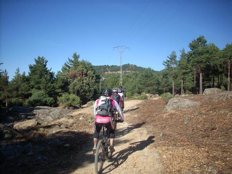 DSCN5808 (Medium)A las 9:00 me llama Totapillao que esta buscando sitio para aparcar la “Jacinta” su furgoneta, me voy a buscarle al cruce del pueblo y le guío hasta el aparcamiento que esta junto al colegio de Becerril, me llama JJ y con la típica voz que ponemos cuando estamos entre dos mundos, no apunto de palmarla, sino medio dormidos, medio despiertos, me dice que esta aún en la cama que se ha dormido que no viene a la ruta. Tras prepararse Totapillao y sus amigos, los Vikingo´s Team comenzamos la ruta saliendo de Becerril por la pista del circuito cola Cao, rampa durilla al principio pero llaneo divertido hasta que nos deja en la carretera a pie de subida a la presa, uso poco este tramo para enlazar rutas ya que casi nunca salgo del pueblo que bueno recuerdos me trae este circuito de correr cuando las zapatillas eran mis mejores amigas, que tiempos aquellos y que lejos quedan ya en mi memoria. Subimos la presa de Navacerrada y cruzamos la presa por la puerta que queda más pegada al monte, algunos pasos con piedras puntiagudas siembran algo de dudas en los componentes pero las pasan sin problemas, tras bordear la parte trasera de la presa entramos a Navacerrada pueblo por el camino de Santiago de Madrid, El ayuntamiento esta haciendo obras en el pavimento adoquinado que tanto le gusta a Pantani por lo