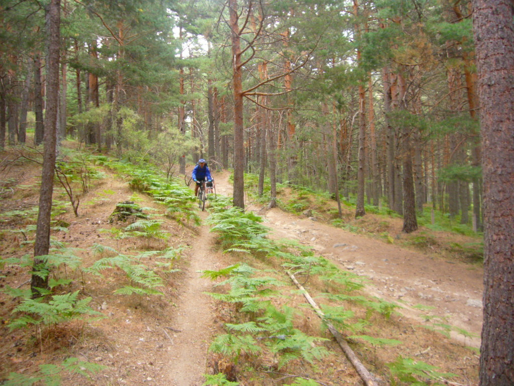 Bajamos a cercedilla por la trialera de marachivas, la bajo cargado y sin poder bajar el sillín, vamos que bajo sentado sobre la tienda tirándome por los sitios más complicados. También aprovechamos para enseñar a bajar mejor a Cristian y que vaya encontrando el Flow de su bici.