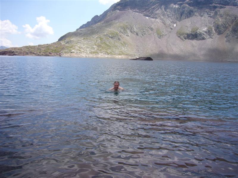 Ascendiendo hacia el lago nos encontramos con una laguna preciosa, más pequeña y humilde que el lago protagonista de nuestra ascensión. El Urdiceto es una maravilla, un lago de aguas cristalinas a 2200 metros de altura, de aguas tranquilas ,frías, cristalinas, tentadoras para darte un baño. Meto los pies y se me quedan helados, el agua estará a unos 8 o 9 grados, Isra se mete vestido hasta las rodillas, cuando de repente se sumerge por completo en las heladas aguas del lago, sale tiritando, completamente helado pero diciendo que es una maravilla, me animo, me pongo el bañador y no me lo pienso, me sumerjo en el lago y al abrir los ojos bajos sus aguas me encuentro con una azul turquesa increíble, es como bañarte en un sueño, del que te despiertas de golpe, el cuerpo te pide salir rápidamente sientes un frío intenso y el no hacer pie en el lago te hace pensar que no puedes aguantar mucho en el, salgo feliz, las nubes se han retirado y el sol calienta mi cuerpo, no tengo foto del momento y me vuelvo a sumergir, quiero sentir de nuevo el beso de la montaña en mi piel, jamás he tenido mayor recompensa al coronar una cima.