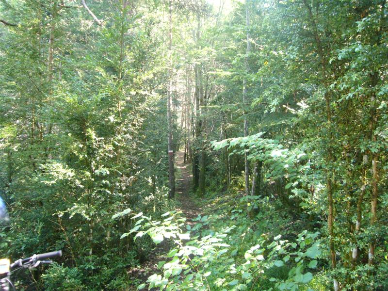 La senda nos deja en una pista que en un ascenso cómodo nos permite ganar algo de altura por la zona del campolino. Un senderista cruza de un lado a otro la pista dejando atrás un sendero que se presenta maravilloso para ser rodado, le pregunto si me dejaría bien para ir al canal del cinca y me dice que es la senda que he de tomar, pero que esta muy mojada y tiene pasos complicados y raíces resbaladizas, esas palabras nos suenan a gloría, nos despedimos del senderista que dirige sus pasos hacia el pico de la Estiveta. Antes de iniciar la bajada unos bikers salen por donde nuestro amigo el senderista se ha metido, nos dicen que ellos han subido algo más para disfrutar de ese sendero y que ahora continúan con este para recorrer también el canal del Cinca, se les ve sueltos y les cedemos el paso. Mass pone la cámara a grabar y nos lanzamos a disfrutar de una senda espectacular, con escaloncitos y raíces que se empeñan en tirarnos al suelo,