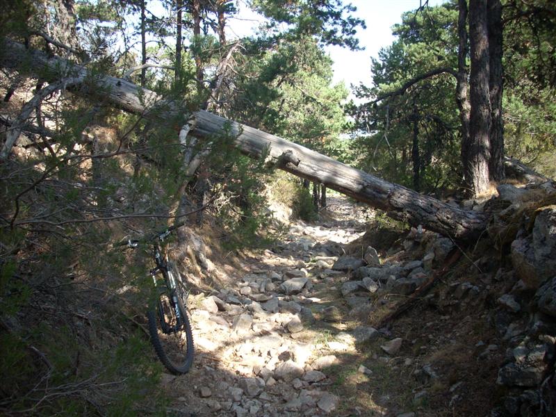 Ruedo por la pista asfaltada hasta la indicación que tengo, el famoso árbol del fauno tendría que estar unos 100 metros más arriba, la subida es un arrastradero con una pendiente terrible que me obliga a portear la bici, me planto sobre el waitpoint y no hay árbol ni semilla que lo germino, pero por suerte me encuentro a 10 metros la senda del ingeniero, así que la disfruto hasta que llego al desvío de la gargantilla. Comienzo a subir con miedo a pesar que las rampas no son muy duras y el terreno se deja llevar, me han dicho que esta subida era un empujabike muy duro y temo encontrarme en cada giro con una trialera de la leche, pero al contrario, me voy encontrado con un terreno disfrutón y precioso que se deja rodar hasta una puerta destartalada que me toca cruzar sin que se desmonte. En este punto los caminos se dividen en dos, como en la vida, en listos y en tontos, y en lugar de seguir el sendero