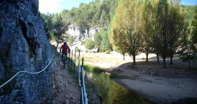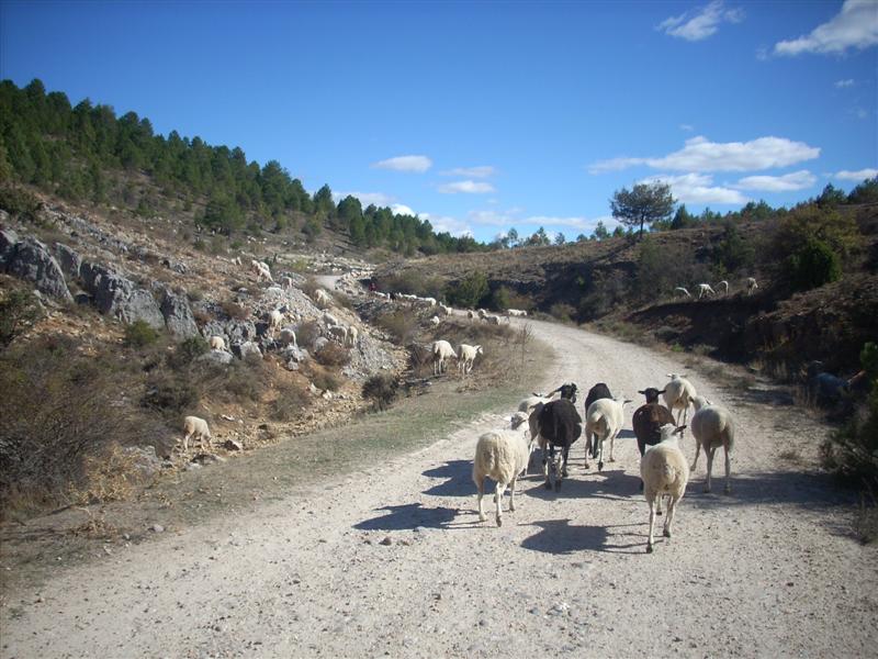 Dejamos el sendero tras pasar por debajo del puente de los siete ojos para tras rodar un rato por carretera desviarnos por una pista que esta en su comienzo tomada por las ovejas y un perro pastor que nos mira con recelo pero sin soltar un solo ladrido. Esta pista en constante pero ligera subida, comienza a pasar factura a JJ y a Cmena que se les nota algo más justos de fuerzas, Dios hace caso a sus plegarias y vuelvo a pinchar lo que les da unos minutos para recuperarse y tomar aliento. Tras reparar el pinchazo nos metemos en una de las zonas más divertidas de toda la ruta, un cañón perpendicular que te deja dentro del principal por una senda alucinante y muy disfrutona llamada GR-86.