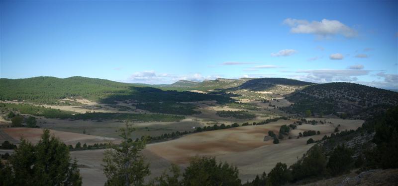 estamos cerca del puente de los siete ojos, una marea de gente que ha bajado de unos autobuses se disponen a entrar en el cañón, menos mal que nosotros salimos por la carretera rumbo a Santa María de las Hoyas para desviarnos por una pista antes de llegar al pueblo. La pista se adentra en un frondoso pinar con algunas praderas en las que pastan las vacas, Pantani comenta que me va a contar como hace él la prueba del hematocrito, yo lo digo que en ocasiones me crece, que a ver si me lo mira en plan coña, a Mass le da una ataque de risa y tenemos que parar, Cmena y Pantani se percatan de que un mastín blanco del tamaño de un León viene hacia nosotros a toda leche, pero Pantani nos saca del error. No es uno sino cuatro mastines inmensos los que han visto en nuestras carnes el almuerzo del día,.JJ, que daba síntomas de cansancio se recupera milagrosamente y sale disparado junto a nosotros, Mass se queda rezagado gritándonos , “ … no me dejéis solo cabrones”, le miro desde lejos gritándole “… Isra pon la cámara a grabar, jajajaja” los perros se quedan muy cerca de su rueda y gracias que se cansaron pronto, ya que 500 metros más adelante la bajada nos deja en un mini puerto que nos sube hasta el esplendido mirador de Costalago (todo este tramo de ruta es gentileza de Totapillao). En el mirador nos encontramos con un biker de Madrid con el que hablamos mientras damos debida cuenta de las chuches de Cmena, un sacrificio para quitarle peso de la mochila. Mientras contemplo el magnífico paisaje castellano, Pantani comienza a sufrir el síndrome del quijote y me pregunta qué tipo de roca es la que se ve a lo lejos y que significa, le digo a rompetechos que no, que yo no veo ninguna roca, pero lo que si veo es una pista impresionante a lo lejos que brilla, Pantani pone los ojos en posición Fari comiendo un limón y se descojona de lo poco que ve de lejos.