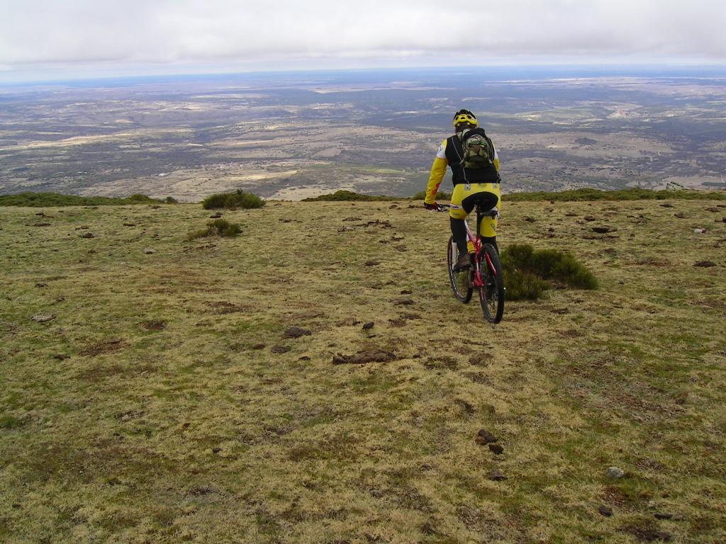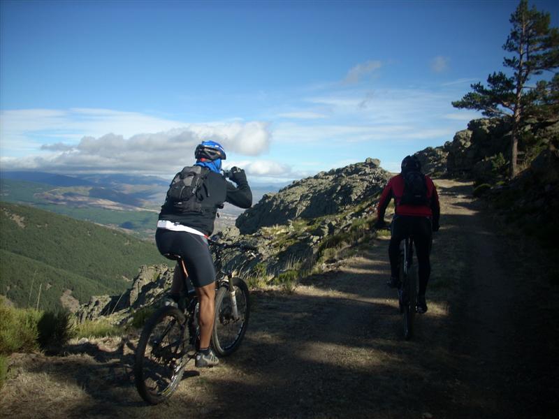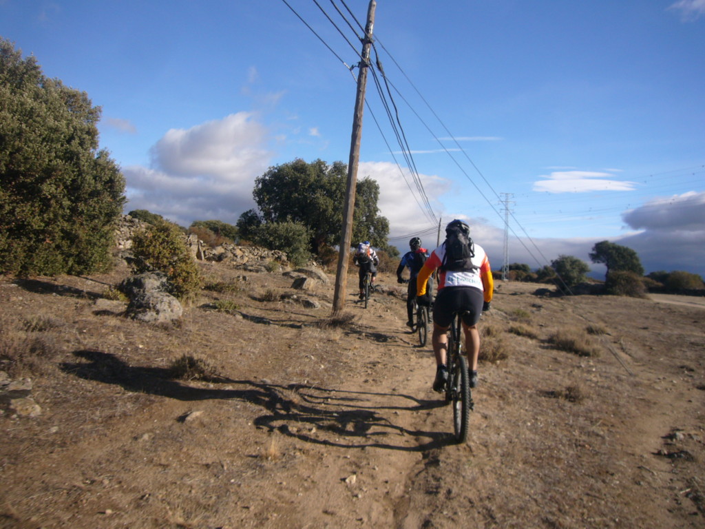 En gargantilla no nos queda más remedio y por asfalto nos dirigimos a Piñilla de Buitrago en donde cumplo con el según objetivo del día. Esta vez recorremos unas veredas preciosas que conducen a su ermita y que se unen al track que tenemos de la última vez en la entrada de SANY0175Villavieja del Lozoya. Con este pueblo comenzamos la ascensión continua por pista hasta el puerto de Linera, El terreno es bueno y se deja rodar, ha llovido la noche anterior y lejos de dejar charcos, nos encontramos un terreno que abraza nuestros neumáticos dificultando el avance. Dejamos sacar a pasear el plato pequeño para con algo más de cadencia y unas buenas risas progresar por las cuestas con alegría hasta que un puñado de vacas se topa en nuestro camino. No solemos temer a las vacas por que la mayoría se retira cuando nos ven, pero en esta ocasión una de ellas lejos de irse, le da un cabezazo al becerro y nos mira desafiantes, yo me arrimo a una que esta al otro extremo del camino, mas gorda y con pelo más largo, cuando estoy entre las dos me doy cuenta que no es una vaca, que es un manso que deja de rumiar para girar su cara y mirarme. Pasamos los cuatro en silencio sepulcral, sin decir palabra hasta que Isra nos dice que tiene mal el amortiguador, intentamos mirárselo pero no conseguimos nada, bueno si perder una mini bola del dial, mientras nosotros mirábamos la bici un todo terreno cargado de comida para vacas ha pasado a nuestro lado deteniéndose unos 800 metros más arriba, giramos la cabeza y vemos como vienen hacia nosotros el manso y la vaca con mirada de mala leche guiadas a palos por un chaval de unos 14 años, montamos todo y continuamos la ascensión acompañando a Isra en su calvario de pedalear incómodo al cambiarle le geometría del cuadro ya que el amortiguador se le queda sin aire, La temperatura es muy variable, las veces que paramos nos tenemos que poner el abrigo ya que el viento que sopla de forma moderada esta helado, pero cuando nos ponemos a dar pedales rompemos a sudar.