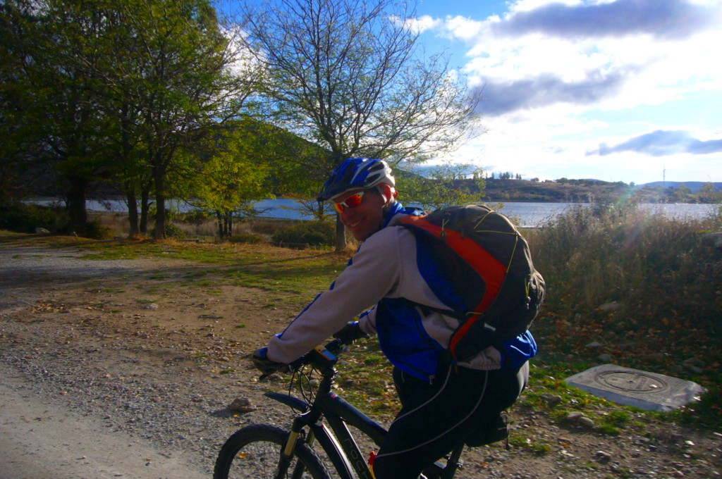 Hemos tenido suerte aparcamos frente a un bar que esta abierto. Isra nos invita a Desayunar para compensarle a Cmena  del ayuno involuntario del día del Urbión. Tras bajar las bicis del Coche damos nuestras primeras pedaladas rumbo al embalse cuando un grupo de senderistas se quieren hacer una foto de salida de ruta. Isra se ofrece voluntario para hacérsela y entabla una pequeña conversación. Isra es así, con un gran don de gentes. Recorremos el embalse hasta llegar a las postrimerías de Gargantilla del Lozoya, cruzamos la carretera y tras dejar atrás la entrada del camping, recorremos una pista que nos conducirá hasta la entrada del pueblo, esta vez sin pisar carretera, primer objetivo cumplido.