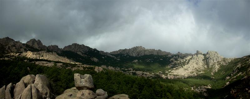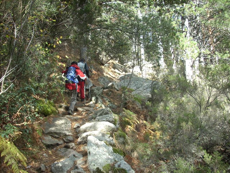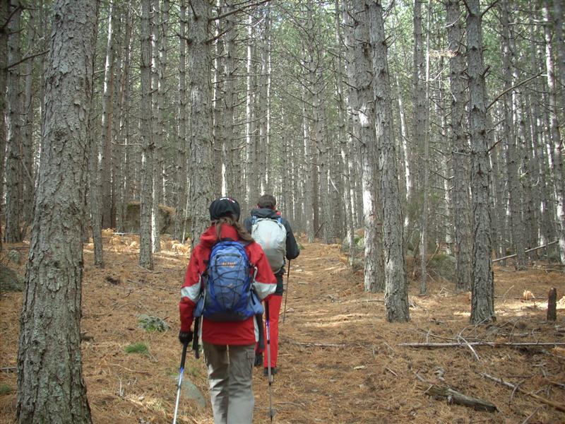 Bajamos de nuestra atalaya para continuar por una senda que se nos mostró clara en nuestro ascenso y acertamos, ya que nos regala unas maravillosas vistas a la zona de los pinganillos donde los pinos y la piedra luchan por cada metro de terreno.