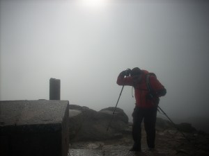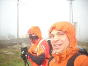 El viento que nos regala la vertiente oeste de la sierra es muy frío, comenzamos a caminar entre la niebla haciendo frente a toda un vendaval de aire frío que nos esta dejando congelados, el termómetro marca 6 grados y bajando. Conseguimos refugiarnos del viento una vez que la senda se adentra en un pinar. La subida la hacemos a buen ritmo y se me pasa volando, JJ me cuenta su viaje a chile y casi sin darnos cuenta estamos a punto de coronar cabeza Lijar. Un perro con cara graciosa y completamente empapado me mira con esos ojillos de felicidad que le da a un animal de compañía corretear libre por el campo, su dueño sale de entre unas rocas, sonrío, parece toda una puesta en escena ya que la niebla que esta muy baja apenas deja ver lo que tienes en un par de metros. Saludo de cortesía y se desvanece en segundos tal y como apareció, me gustan estos senderistas de la vieja escuela, calcetines de cuello alto de los de por debajo de la rodilla y zurrón de cuero para el almuerzo. Alcanzamos la cumbre de cabeza lijar pero apenas somos capaces de mantenernos en pie sobre el bunker por lo que nos
