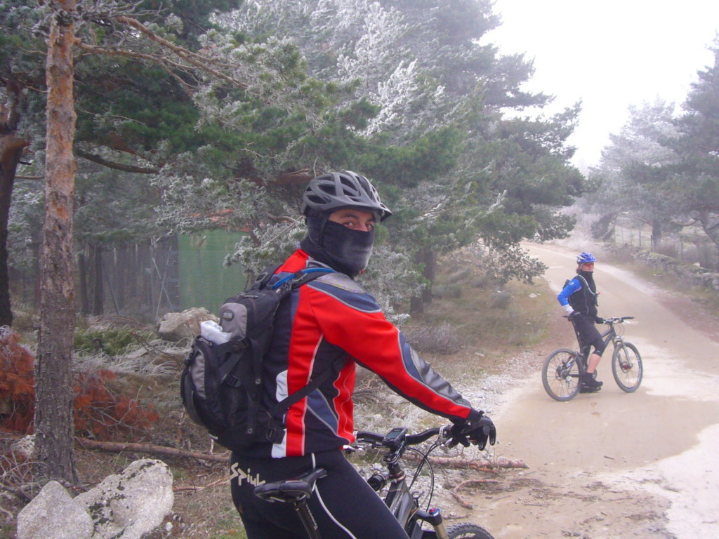 Hace frío, a Cmena no le veo con muchas ganas de dar pedales, tiene agujetas por todo el cuerpo ya que no esta acostumbrado a andar y le metí una buena paliza por Somosierra trepando entre las rocas para ver la cascada. Gamusino es una de esas personas que te caen bien desde el primer minuto que la conoces, afortunadamente yo hace años que me he podido reír con el y le da un punto extra de humor a la ruta. Dejamos Cercedilla por el camino que nos conduce a la subida de la Molinera, pero la dejamos atrás para rodar por una pista que llamamos el petatontos, ya que parece totalmente llana pero rodando en sentido contrario al que llevamos de Guadarrama a Cercedilla te deja muerto si vas un poco tocado. Pasamos por un pinar que tiene historia, cada vez que paso me viene a la memoria las dos caídas brutales que sufrió Mass en apenas 20 metros. Las recordamos señalando los lugares dejando una estala de carcajadas tras nosotros. Nos cruzamos con algunos bikers que van como los bandoleros, apenas se les ven los ojos protegidos de un frío intenso. Rodamos rápido por la pista disfrutando de lo duro del terreno y de la ligera pendiente descendente que nos invita a rodar rápido sin esfuerzo, a ambos lados del camino las vacas pastan prados blanquecinos por la pelona nocturna, Isra se deja llevar por la velocidad, se mete en una curva un tanto ciega y no ve una vaca que esta en el interior pasándole la cara a escasos centímetros de su pestilente rabo , la cara de Isra era un poema cuando se giro con un “… joer casi me la como no la he visto” y anda que era pequeña.