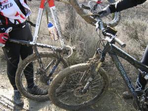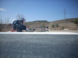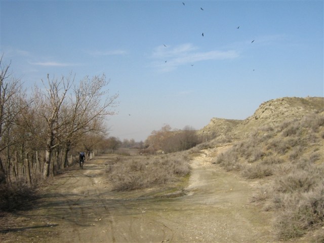 En esto punto me doy cuenta que algo no va bien, no tengo fuerzas en las piernas, físicamente me encuentro perfecto, no estoy cansado pero me cuesta un triunfo dar cada pedalada, le digo a mis compañeros que no quiero retrasarles que yo me doy la vuelta, que no es mi día. Me animan a seguir un poco más y las ganas de completar la aventura pueden con mi patético estado de forma. Alternamos pistas en estupendo estado con tramos asfaltados, un larga subida de 200 metros de desnivel en 12 kilómetros, que me obliga a poner el plato pequeño me da la puntilla, me ha quitado la chaqueta al comenzar a sudar y al poco comienzo a sentir un frío intenso, rodamos por cañadas paralelas a vides y comienzo a tiritar, no entro en calor ni rodando en llano, voy completamente destemplado con náuseas. En la bajada a Tielmes me recupero un poco, se me pasan las náuseas y como es la hora de comer asaltamos una panadería con charcutería, cosas de los pueblos. Mientras Despi compra víctor le tira los tejos a la dependienta, una mujer casada que se deja alegrar la mañana. Comemos a las fueras del pueblo, en una zona con mesas y bancos a la orilla del río sacavém, en donde encontramos un jersey de niña adolescente, y dos sostenes negros de talla curiosa, vamos que seria curioso ver lo que sostenían.