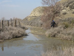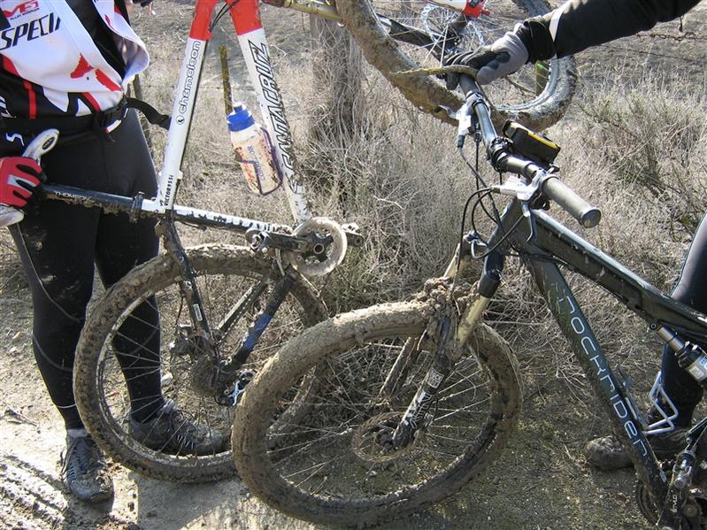 Es sábado y la ciudad se hace la remolona para iniciar su actividad desenfrenada, rodamos por calles con poco tráfico de coches y algunos noctámbulos a los que les ha sorprendido la madrugada. Por el parque lineal del Manzanares rodamos por terreno más acorde a la naturaleza de nuestras monturas, nos cruzamos con otros bikers y corredores que disfrutan de este magnífico parque y su río que baja crecido por el generoso invierno en lluvias que hemos tenido. Intento hacer una foto de nuestra progresión pero mi cámara de fotos a muerto definitivamente, este viaje no comienza nada bien. Paralelos a las vías del AVE vamos hacía Rivas, los caminos se presentan algo embarrados y Despistado hace algún que otro trompo con la bici al perder el control de su rueda trasera, el barro deja de ser una anécdota para convertirse en un problema, mi rueda delantera lo acumula en demasía por lo que tengo que parar un par de veces para limpiar el puente de la horquilla, rodar se me hace muy pesado y me voy dejando las fuerzas en un tramo que esta vez si, y literalmente diré que muy pestoso en el que apunto estoy dos veces de caer por perder el control de la rueda delantera. En unagasolinera de Rivas limpiamos como podemos las bicis y engrasamos las cadenas para no tener problemas mecánicos. El parque regional del Sureste es una delicia con su precioso lago, algunos pescadores disfrutan de su deporte favorito con un cerveza en la mano sentados en confortables hamacas, en ocasiones pienso que me he confundido de deporte. Un sendero curioso a orilla del río Jarama nos dejara en uno de esos puentes de metálicos como los de las películas del Oeste, Víctor se lo hace montado mientras Despistado y yo lo hacemos empujando las bicicletas, al llegar al final del puente víctor nos homenajea con cacareos de gallina, pero la verdad si ya me ha costado ir empujando la bici sin caerme no me imagino ir montado sobre ella.