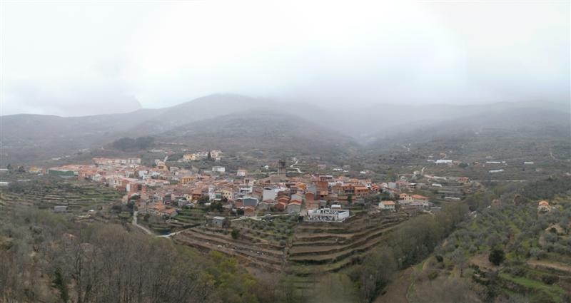 Dejo la carretera ancha por otra mucho más estrecha, la lluvia no es muy intensa pero la niebla muy cerrada lo cubre todo. En ocasiones parece tentarme y jugando conmigo se abre dejándome ver unas vistas maravillosas del Valle de la zona del Jerte. Paso el pueblo del Piornal y me enamoro perdidamente de su carretera que une esta población con Garganta de la Olla.