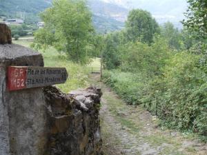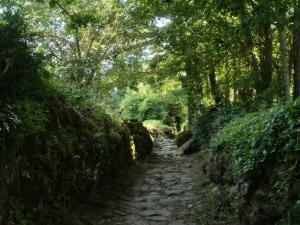 En la recepción del Camping me han dicho que una senda preciosa lo comunica con el pueblo. El sendero es de piedra precioso, las rocas verdosas por el musgo lucen frías, abrazadas por la vegetación que lo cobija del sol agobiante que pega de lo lindo, bajo la