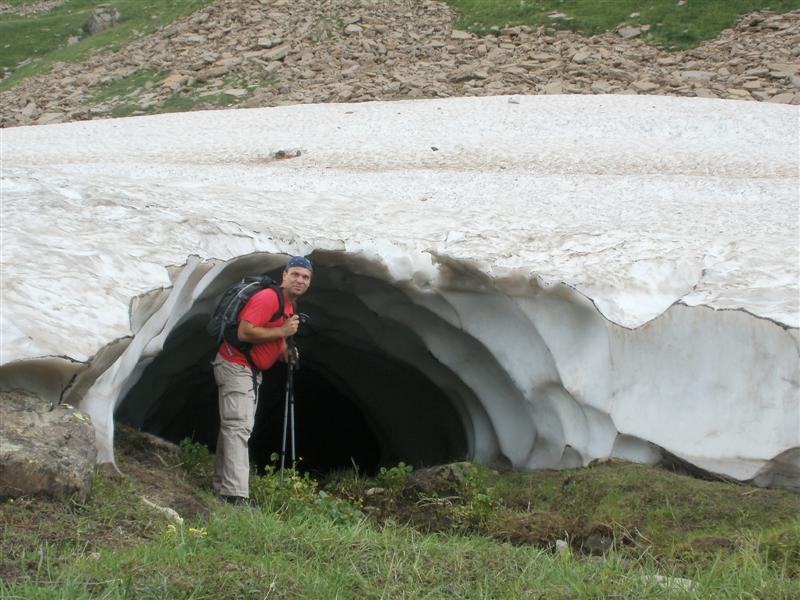 Coronando una pequeña cima sobre la cabaña descubro una cascada que con furia pega un buen salto, subo hasta su nacimiento para descubrir que el río sale de un nevero inmenso y este a horadado un túnel de más de 2 metros de alto y algo mas de un metro de ancho con un buen grosor de cúpula, no puedo dar crédito a lo que veo.