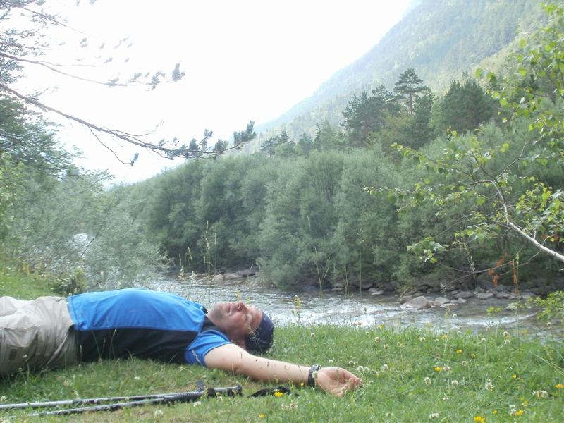 Llego rendido a la pradera donde se toma el autobús para retornar a Torla, caigo rendido en el césped junto al río. Una cosa es volverseun poco radical en la montaña y otra no tener piernas pora conseguirlo,  me monto en el autobús de bajada que deja cerquita del camping.