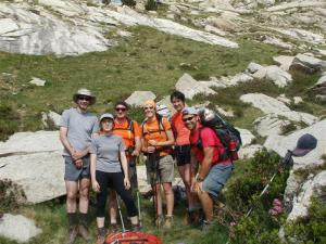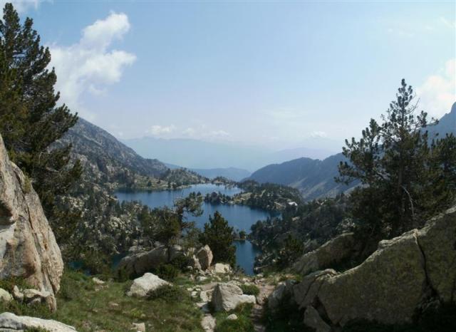 pueda, parece ser que se les ha despertado un hambre voraz y las femeninas se pasan el día comiendo. Nos toca volver a bajar a un refugio el de J.M. Blanc y volver a subir con la cartilla sellada para que nos den la camiseta. Noe esta muy cansada, así que la dejamos a cargo de las mochilas. Esta vez nos toca a JJ y a mi ir a sellar, nos habían avisado los navarros que las vistas desde de arriba del refugio eran inolvidables textualmente “… es como un pequeño jardín zen pero con lagos” y la verdad la imagen cuando lo ves es impactante. Para bajar al refugio hay un paso un tanto complicado en el que hay que trepar, veo que JJ lo puede pasar mal y le digo que su vuelva con Noe que ya voy solo. Bajo a muy buen ritmo y en nada consigo los sellos y retorno, me encuentro físicamente genial sin la mochila a la espalda. La zona en donde esta enclavado el refugio es una maravilla, creo sin temor equivocarme el refugio mejor situado de la carros de foc que dejará un recuerdo inolvidable en la memoria de todos los que la recorran y además tengan la suerte de elegirlo como lugar de descanso.