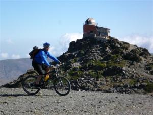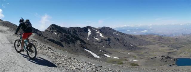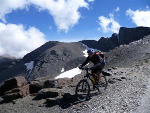 El ciclista patoso nos adelanta y le vemos como se dirige hacia el Mulhacen, al verlo pedalear hacia la gran cumbre de la península Isra me propone coronar también nosotros, pero le hago ver que eso supondría trastocar nuestros planes y que tendríamos que haber salido mucho antes, además las piernas nos recuerdan nos solo la subida de hoy, también la ruta de ayer que fue algo durilla.