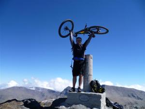 Estoy feliz, para mi era importante subir aquí y mas hacerlo con un gran amigo. Lo celebro haciéndome una foto con mi bici en la cumbre. Encontramos un rincón protegidos del viento y comemos disfrutando del espectáculo que siempre brindan las alturas. Un ciclista sin casco y un tanto torpe corona el veleta andando bajo nuestra mirada, es muy torpe y el intentar ver como se hace una foto con la bici en el vértice geodésico es todo un espectáculo.