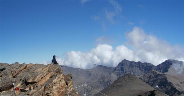algo de chocolate pero cojo algo de frío en el estomago y lo paso fatal durante unos cuantos minutos. Una vez que superamos los 3.100 metros comienzo a encontrarme mucho mejor y no acuso en absoluto la altura, subo con mucha facilidad y solo pongo pie a tierra en el último giro antes de coronar el veleta a escasos 50 metros del vértice geodésico recibiendo los aplausos de los senderistas que me han vistos superar las rocas del último tramo.