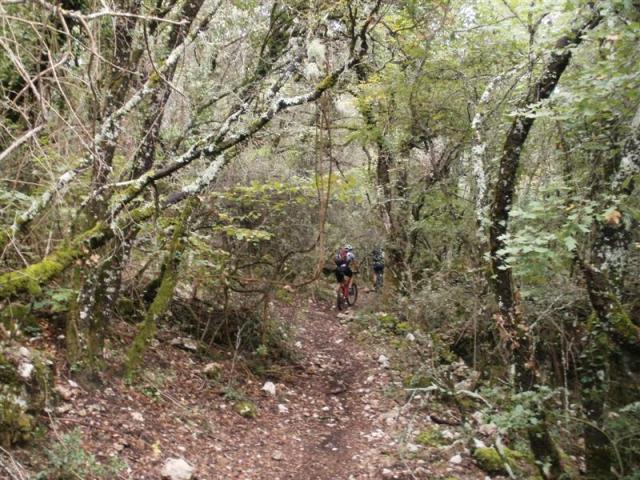 Salimos del Pueblo siguiendo un track bajado de Internet que nos descubre el nacimiento del río mundo y nos invita a rodar por alguna senda divertida según he podido leer. Tras un par de kilómetros por carretera tomo un desvío por pista que intuyo, ya que el track no era nada claro en este punto que nos conducirá al primer bucle que tenemos que recorrer, me adelante unos metros y cuando vuelvo junto con mis compañeros estos ya han decido que no era el camino correcto subiendo hacia la carretera de nuevo y continuando por ella, ya lo dijo Unamuno la Razón es Social. En el siguiente cruce nos desviamos por un pequeño pueblo, La casa de la Noguera, con un lavadero comunitario muy bien cuidado con buenos chorros de agua y la colada a modo de estandartes ondeando por las calles. El final del pueblo nos regala una senda maravillosa, algo técnica y embarrada. Yo ya no voy rodando de muy buen humor, creo que vamos mal y mi neumático apenas agarra en el terreno. Recorremos toda la zona técnica hasta desembocar en una pista muy embarrada con grandes charcos que nos conduce hacia el nacimiento del río Mundo, me doy cuenta que estamos haciendo el track en sentido contrario y temo que si continuamos por este caminos podamos dar con una subida que podría ser una trialera de bajada, como ya la ruta esta perdida y la verdad me da lo mismo, se que no tendría que tomarme las rutas tan en serio y disfrutar por estar rodando en un sitio maravilloso, pero me cuesta demasiado. Volvemos a disfrutar de la senda técnica que en este sentido es más divertida y volvemos a hasta tomar la pista que a primera hora habíamos descartado. Cuando algo sale mal, ya todo puede salir mal y me vuelvo a equivocar en un par de cruces, soy demasiado cabezón y cuando se rueda en grupo no se puede buscar hacer las cosas bien. Cruzamos una valla y cambia el paisaje, algo más agreste y divertido para nuestras máquinas. Pronto llegamos al nacimiento del río Mundo y un forestal no nos permite acceder a la cascada por la senda mandándonos por el acceso de los minusválidos un poco mas arriba pero que da al mismo sitio. El entorno de la Cascada es maravilloso, fijándote en algunos detalles resulta hasta como de decorado de película. Pero falta luz, caudal de agua en la cascada y sobretodo ganas de disfrutarlo por todas las dificultades que nos vamos encontrando en el camino. Comemos algo y decidimos no completar el track y volver a bajar por donde habíamos subido para bajar un tramo muy técnico que habíamos subido andando.