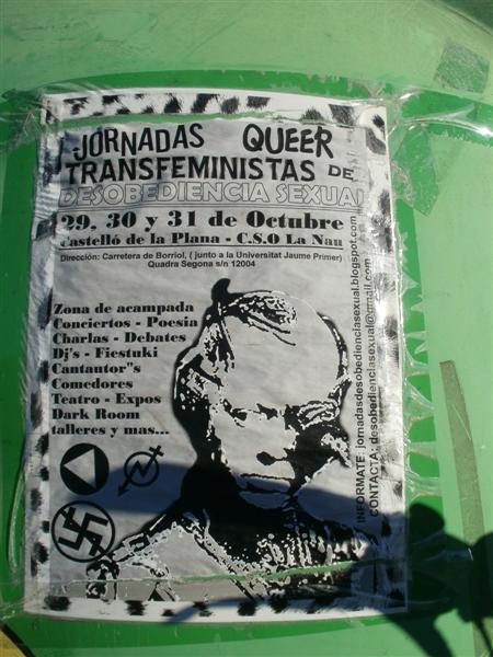 Comenzamos la ruta desde la localidad de Soneja, vemos que en la estación hay coches aparcados con los porta bicis señal que la vía verde no anda lejos. Aparcamos junto a unos contenedores de vidrio en el que nos sorprende un curioso anuncio “Jornadas Querer Transfeministas de desobediencia sexual” y como ponía la dirección del blog no he podido por más que leerlo y en su manifiesto dicen “…Porque somos individualidades rabiosas, no normativas, inconformistas, contestarías. Porque ser descaradas, sin vergüenzas, putas, perras, lobas, zorras, divinas y divas, no nos produce el más mínimo sentimiento de culpabilidad.” Así me gustan a mí las mujeres con las ideas muy claras y sin ataduras.