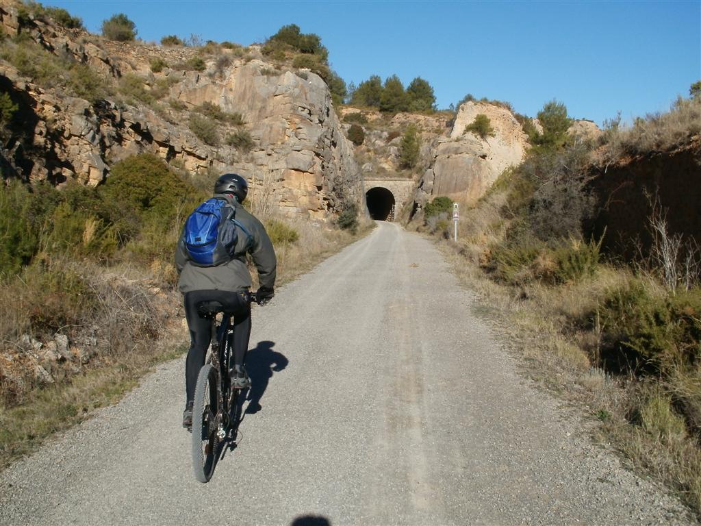 La vía nos ofrece un continuo cambio de paisaje alternando pinos, con olivos y naranjos, el firme esta perfecto para rodar y podemos ir charlando sin problemas, en altura un amable vejete en silla de ruedas nos indica la dirección para tomar la vía verde hacia la izquierda, curiosamente detrás de el había una placa que ponía hacia la derecha y así lo indicaba también mi GPS, le damos las gracias pero le decimos que iremos en dirección contrario pillándose un buen cabreo, cuanto daño está haciendo la crisis del ladrillo en nuestra tercera edad, esto de no poder ver Obras y dirigirlas les va a quitar la ilusión de vivir.