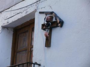 Alcanzamos el pueblo de Jérica, nos llama la atención su torre y nos vamos a verla, bonitas cuestas la de esta pueblo, para compensar el esfuerzo nos tomamos un bocadillo y continuamos pedaleando por unas calles en las que esta prohibido circular en el sentido que lo hacemos salvo “tracción animal”, como Borja y yo animales somos un rato entendemos que podemos ir en este sentido. En una de las calles me encuentro con un muñeco colgado en una fachada crucificado sobre una cruz con al cara quemada como de un disparo y una escopeta colgada sobre el, hay cosas en los pueblos que es mejor no preguntar, vemos la torre y salimos corriendo.
