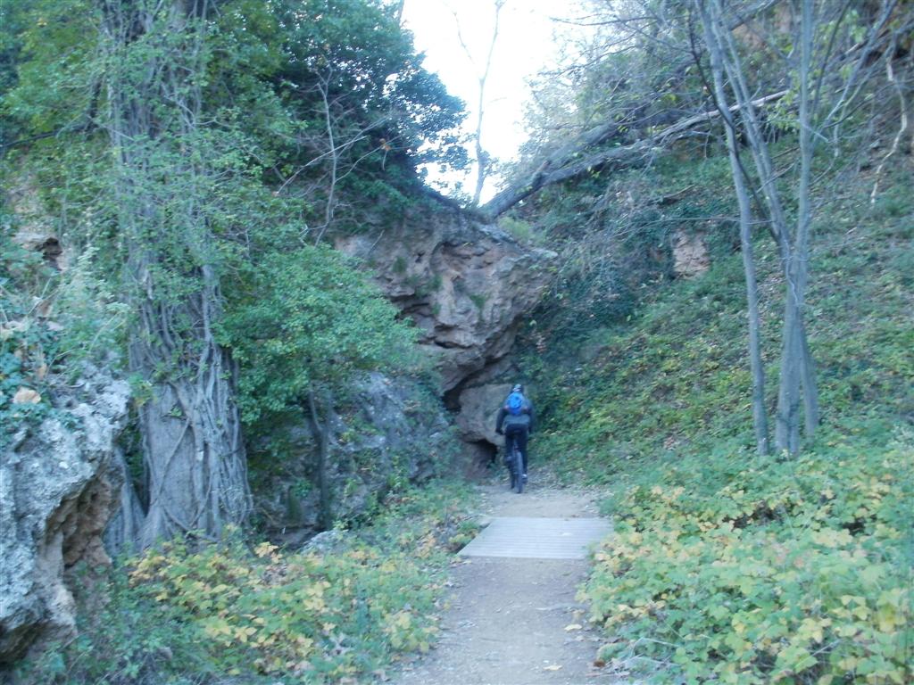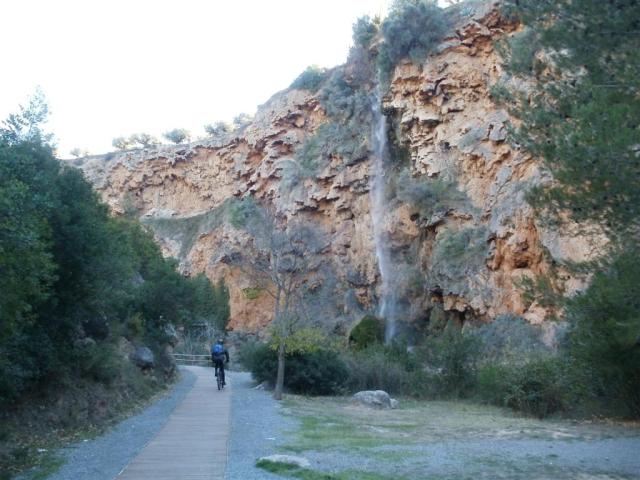 Hemos decido rodar hasta Caudiel, vía comienza a tomar algo de inclinación. Damos una vuelta por el pueblo y al retomar el camino de vuelta vemos que en la entrada del pueblo junto a la vía verde han puesto una ducha para quien quiera darse un refrigerio. Una pareja de vejetes de los del plan E, los que explican las obras, nos dan una charla y nos venden el pueblo como una maravilla para vivir, nos despedimos de ellos y esta vez en bajada agradecida nos plantamos en nada en el cruce con la localidad de navajas en donde nos desviamos hasta el embalse para tomar el margen izquierdo del río Palancia y disfrutar de una bajada divertida hasta unas pequeñas sendas que nos dejaran en el área del Salto de la novia con sus cascadas y sus pequeños lugares maravillosos en los que me quedaría medía tarde disfrutando de ellos.