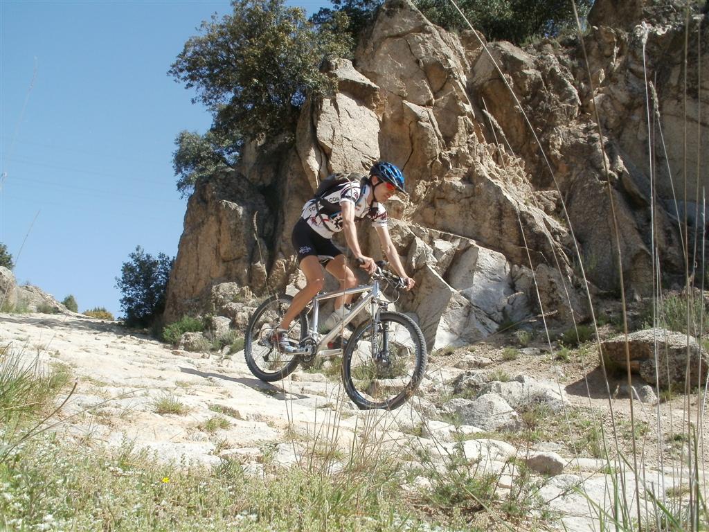 Por fin me hago la bajada entera hasta el puente de la marmota sin bajarme de mi querida doble, como adoro a esta bicicleta, alcanzo a un biker que nos había pasado en la subida y me dice que el no lo intenta ni por mil euros. Sin apenas descanso nos penemos con el sendero divertidísimo que nos conduce hasta la pista de los rompepiernas. Hasta ahora mi rodilla no ha dado síntomas de dolor y físicamente me encuentro genial, hace un calor de mil demonios y comenzamos a buscar las sombras cada vez que paramos un minutillo para recuperar el aliento, cuando en las zonas técnicas hay que tirar de riñones. Unos senderitos más y la vía parque hacía Hoyo de Manzanares en donde frente a la academia militar decidimos hacer un buen descanso para comer mientras vemos como un coche de rally se deja sus buenos 20 euros en cada acelerada que le mete al motor dejando un ruido ensordecedor.