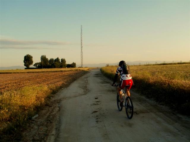 A ritmo constante sin alardes vamos tejiendo los kilómetros de un sueño, de una idea , de una ilusión que pensamos podemos conseguir pero aún la vemos muy lejos apenas perceptible. Pasamos junto a un gran perro que dormita en mitad del camino, no abre ni los ojos al acercarnos a pesar de pasarle casi rozando. El camino nos invita a coger velocidad pero los inmensos surcos que lo cruzan nos obligan a ir buscando la trazada perfecta para no dar con nuestros huesos en el suelo.