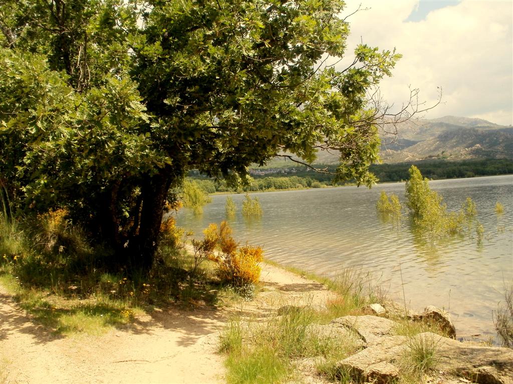 La presa presenta un aspecto imponente, jamás había rodado con tanto nivel de agua lo que hace que las sendas estén embarradas cuando no bajo las aguas como los puentes para sortear las zonas encharcadas de costumbre. Como no podemos cruzar por donde siempre nos buscamos unas rocas para sortear el arroyo, una mujer se cachondea de nosotros mientras llama a su hijo “.. ven mira como cruzan los ciclistas y como se van a caer” estoy seguro que era medio bruja pues nada más decirlo Jose resbala y cae sobre su bici en el barro ya que cargaba para no mancharla. Tras ver que Jose esta bien y se contiene de dar un baño de lodo a la señora que huye del lugar por gafe, decidimos dejar la presa y continuar nuestro viaje por el pueblo de Navacerrada que dado la hora nos lo encontramos con las terrazas repletas disfrutando de los aperitivos. Otro tramo de carretera nos saca del pueblo y nos dejara en la fonda Real en donde retomamos la pista y nos encontramos con Nanotron y compañía que terminan su ruta serrana. Breve charla y continuamos ascendiendo. Pero mi cara ha cambiado y comienzo sentir la sombra de la petación rondando mis piernas.