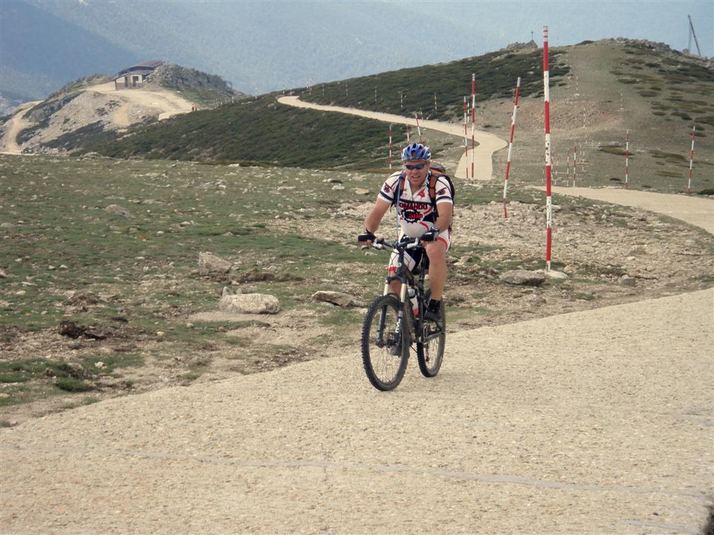La gente que me cruzo me anima, le digo a uno que hay que estar gilipollas para subir hasta aquí en bici y me responde con un “.. Si pero mola”. Me niego a bajarme de la bici en los últimos metros, tal vez los más duros, voy sin velocidad solo en equilibrio y ante la bola me dejo caer, tumbándome en el suelo y jurando que jamás volveré a repetir esta ruta. Hace frío, me pongo el chaleco y comienza a chispear sucediéndole el granizo. Pienso jodete, esta vez no has podido, ya nos puedes tirar piedras, nos hacemos una foto, la del triunfo, la de la victoria, la del orgullo de haber culminado un proyecto haciéndolo realidad con todas tus fuerzas hasta la extenuación. Para muchos será una tontería, para otros más fuertes y mejor preparados no será para tanto, pero para mí, por como estoy físicamente y mis dolores ha sido mi dosis de gloría tal y como diría Honoré de Balzac La gloria es un veneno que hay que tomar en pequeñas dosis.