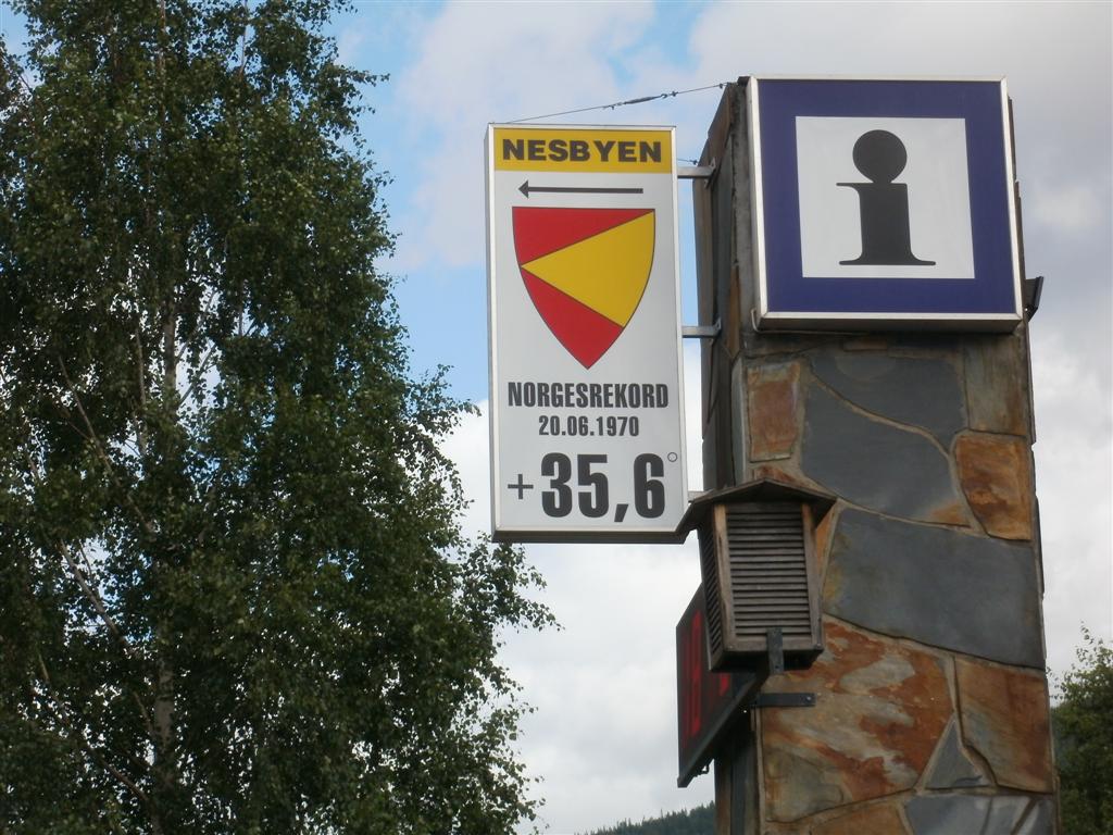 En una parada para estirar las piernas nos encontramos con un curioso cartel que marca + 35,6 y resulta ser el record de temperatura máxima registrado en noruega el 20 de Junio de 1970 en la localidad de Nesbyen en donde estamos. No puedo imaginarme este país con la temperatura de andar por casa en Julio.