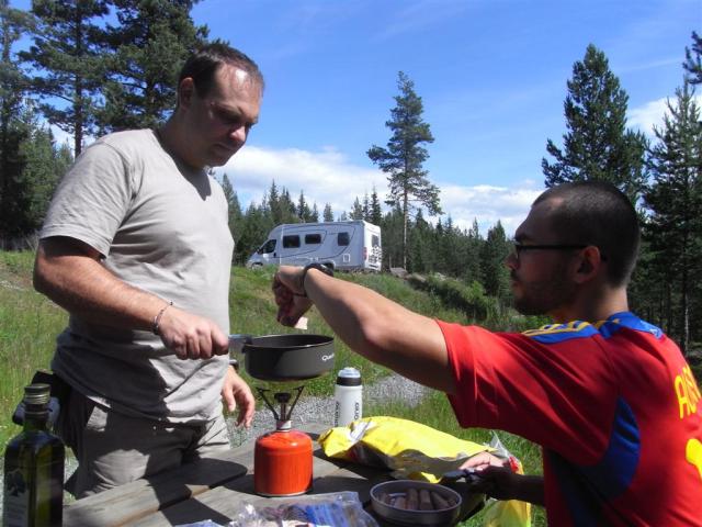 Defraudados por la visita y con hambre, decimos hacer uso de las mesas para preparar la comida y nos metemos casi para el cuerpo un paquete de salchichas riquísimas que hemos comprado.