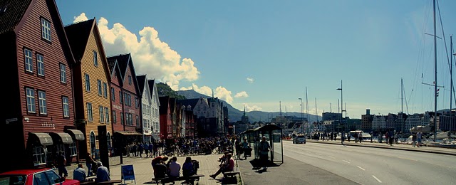 mundo, Una broma común que se cuenta en la ciudad es una sobre un turista preguntándole a un niño si en alguna ocasión para de llover. «No lo sé,» responde el niño, «sólo tengo 12 años. Lo cierto es que nosotros nos encontramos a un español que llevaba un mes en Bergen trabajando y era el primer día que no le llovía. Gracias a este compatriota cumplimos otro de los objetivos del viaje que era probar la carne de ballena, algo prohibitivo para nuestro bolsillos si no llega a ser por el, y la verdad que si bien probamos una porción equivalente a la uña de un dedo gordo nos apasiono, estaba deliciosa. La probamos ahumada y después un poco de salmón marinado que fue toda una delicia también.